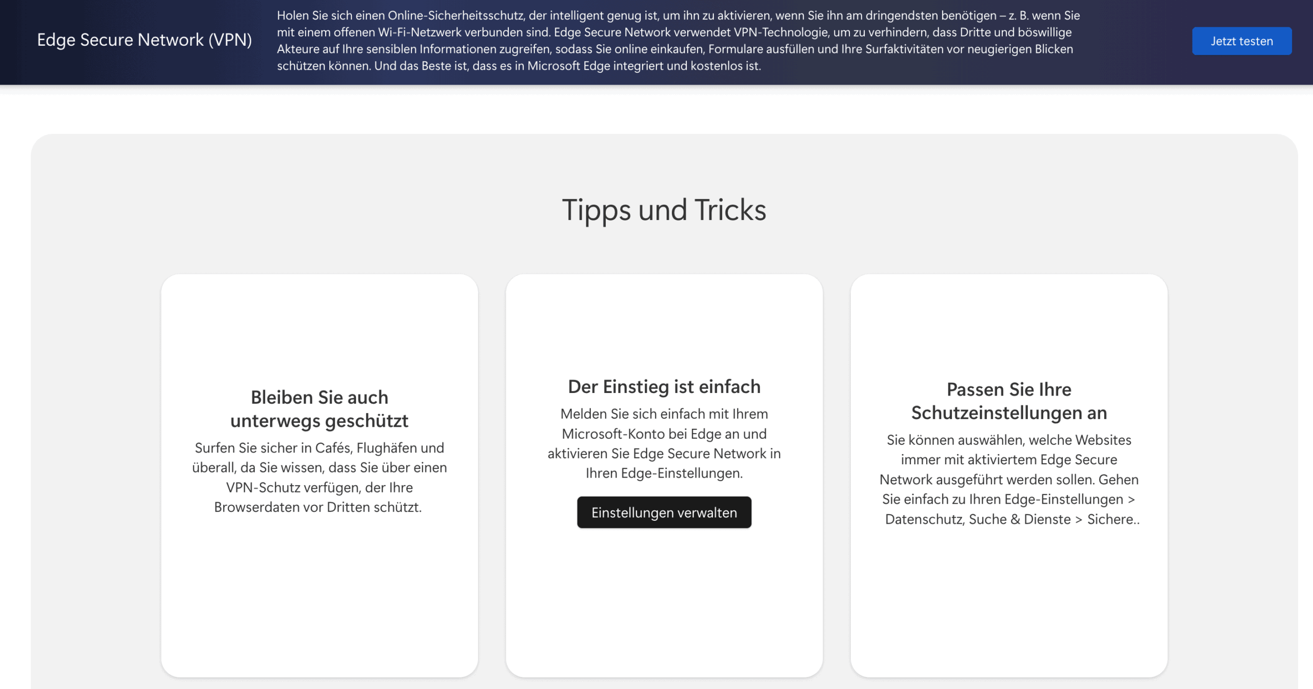 Meine Erfahrungen mit VPN-Diensten zeigen, dass das Edge Secure Network eher ein Proxy als ein richtiges VPN ist. Du wählst hier auch keine Server aus. Ich sehe das VPN daher als erweiterte Browser-Schutz-Funktion mit Verschleierung. Ein vollwertiges VPN ersetzt es nicht.