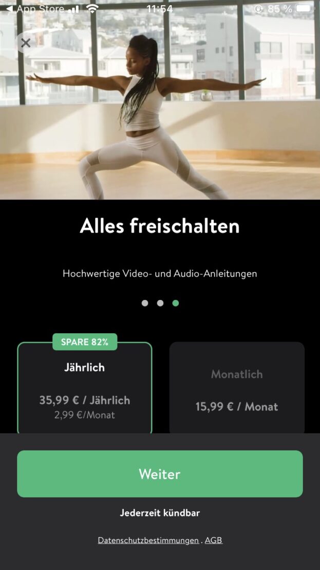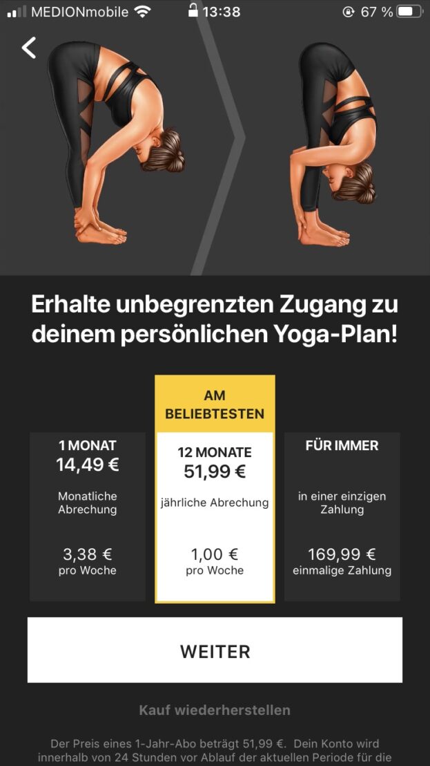 Yogaeasy ist eine gute Yoga-App, die für iOS und Android erhältlich ist. Du hast die Möglichkeit eine Woche lang in das Angebot herein zu schnuppern, bevor du dich für eines der folgenden Abos entscheiden musst: