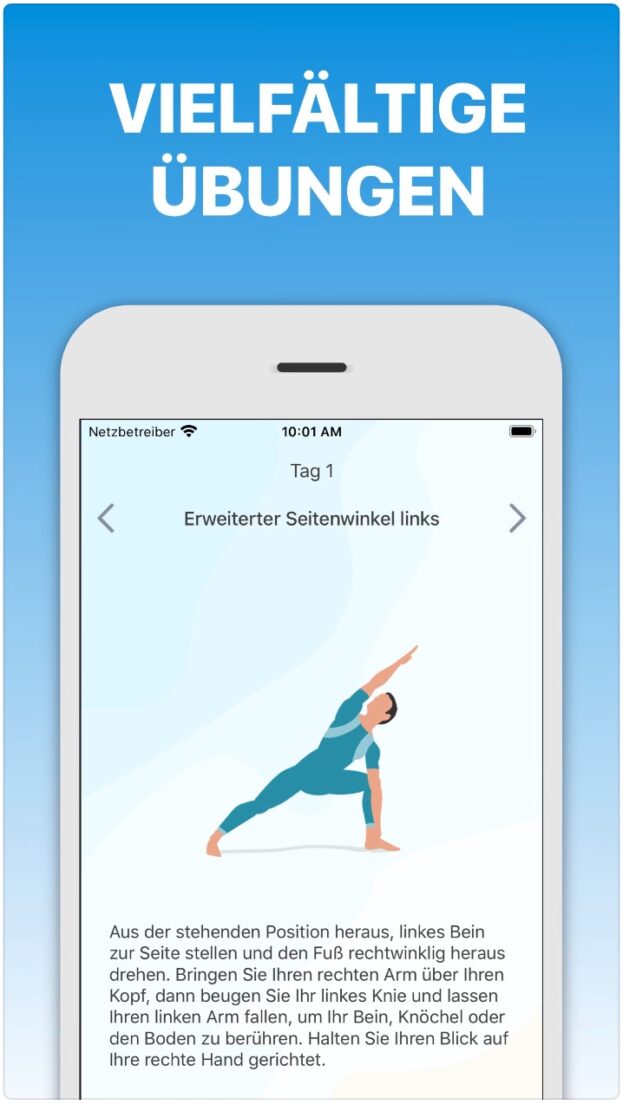 Unter dem Motto „An apple a day…“ bietet dir 5-Minuten-Yoga Mini-Workouts mit denen es dir leichter fallen soll, auch im stressigen Alltag eine tägliche Routine zu entwickeln. Das Angebot ist minimalistisch gehalten, denn auf Musik oder eine Audio-Anleitung verzichtet die App.